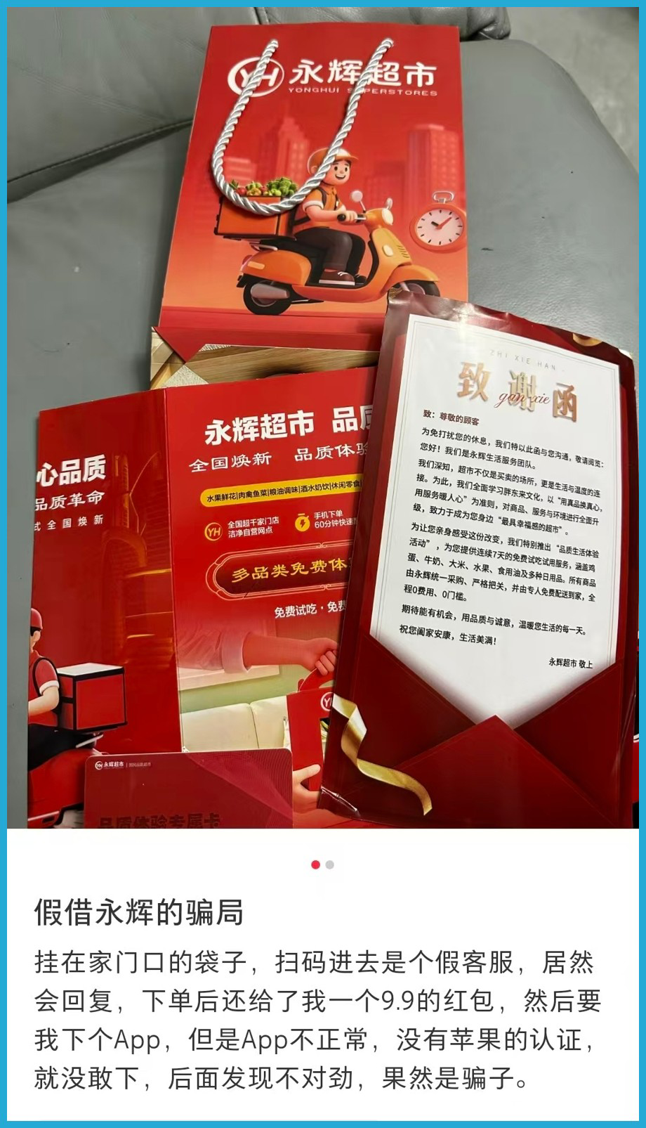 而随着“假冒盒马试吃陷阱”的曝光,其他类似骗局近期也纷纷浮出水面。上门投送的“试吃”礼品袋,还涉及“永辉”“京东”等多家新型零售超市。有网友称,扫码后进入客服页面,客服称“邀请新老客户参与试用试吃活动”,并要求提供姓名、手机号、收货地址等信息,诱导下载App。“卡片看起来样式精美、很真实,扫码后才察觉异常。”