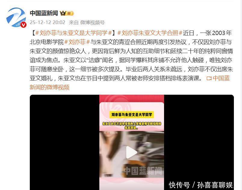 据12月12日报道,一张二十年前的校园旧照,竟在年底冲上了热搜。照片里,16岁的刘亦菲清丽脱俗,19岁的朱亚文阳光俊朗,两人青涩未褪的“神仙颜值”瞬间惊艳全网。但真正让网友“破防”的,远不止颜值暴击,而是这张照片背后,一段跨越二十年、未被名利场浸染的纯粹同窗情。