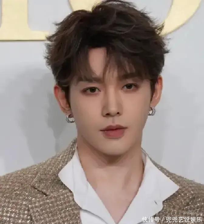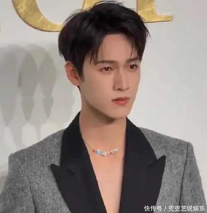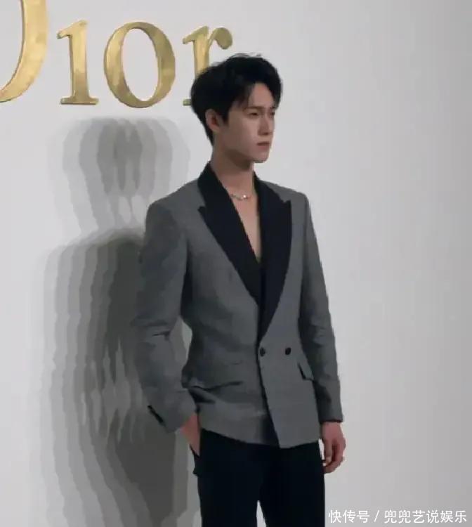 李昀锐先撞进我的视线。深V黑领、灰色修身西装、黑西裤,锁骨发光,项链加分。
